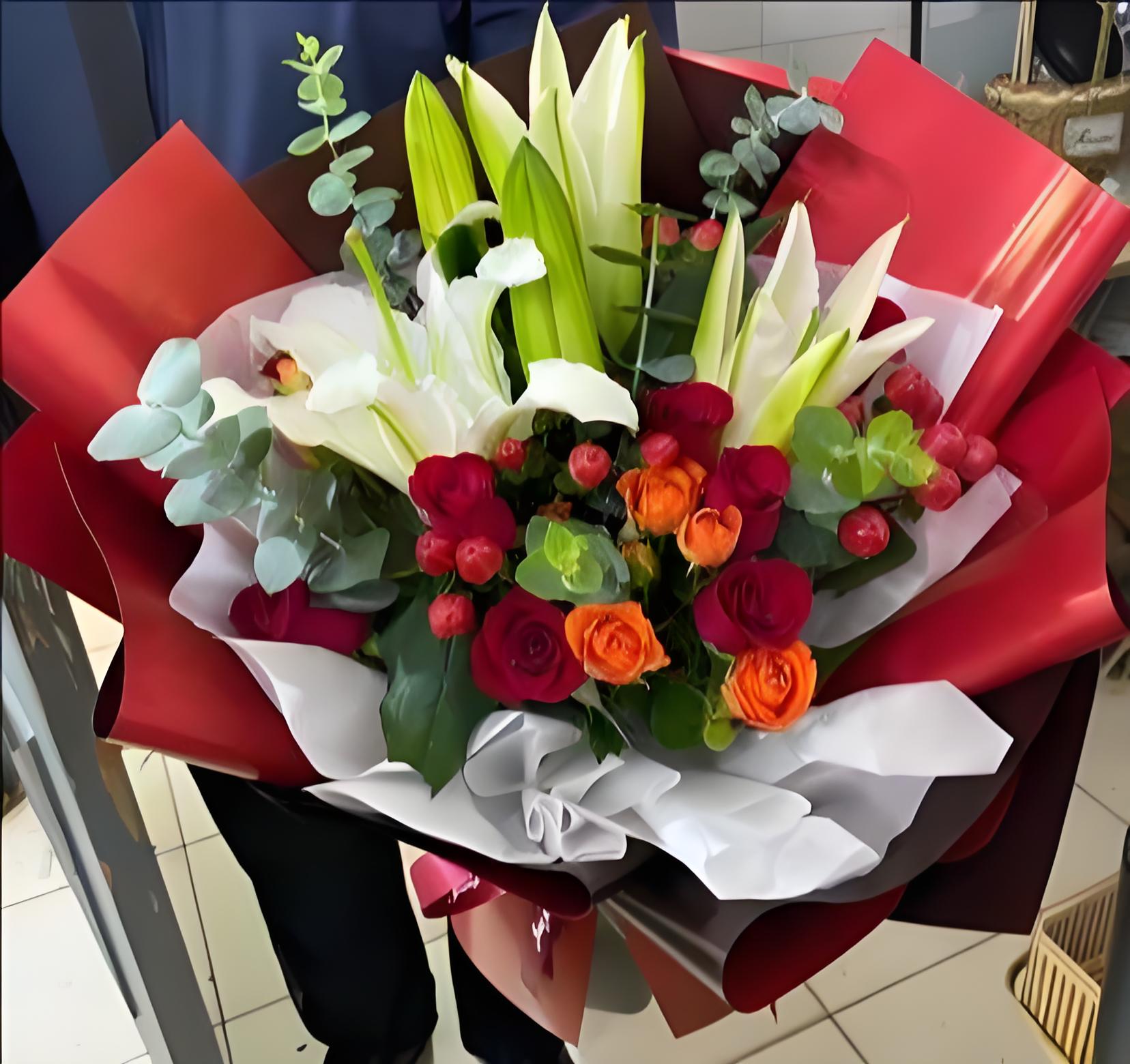 德阳广汉市花店包11枝红玫瑰、2枝多头白百合、6枝橙色多头玫瑰、红豆、尤加利叶